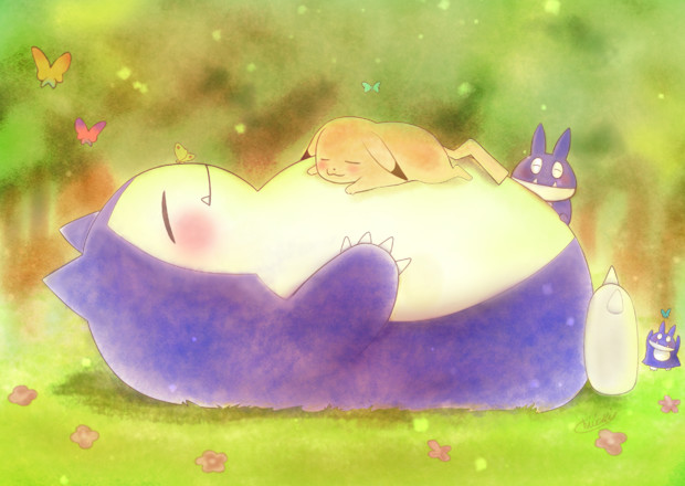 カビゴンのお腹ですやすや眠るピカチュウ 千秋 もふ族 さんの