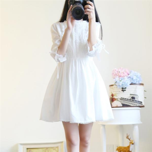 白ワンピース ミモレ丈 夏ワンピ 綿ワンピース ひざ丈 Aライン 五分袖