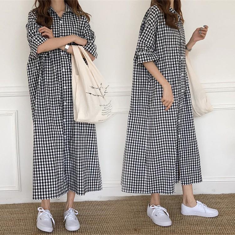 韓国系チェック柄ワンピースvネックレディース ロング丈ゆったり