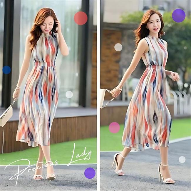 レディース ワンピース ロング丈 ストライプ柄 ノースリーブ