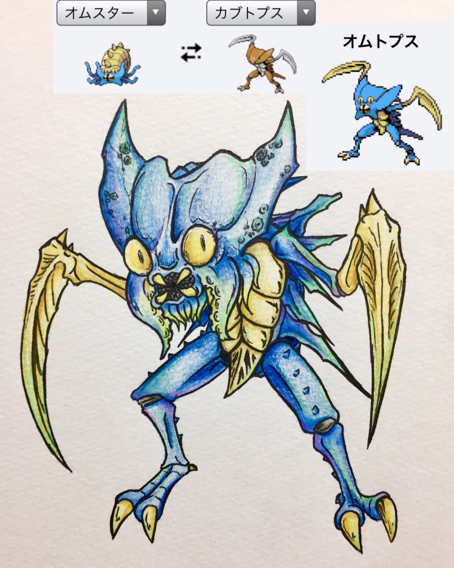 レンジ Twitterren ポケモンフュージョンの オムスターとカブトプスを合わせた オムトプス を色鉛筆で描きました ポケモンフュージョン