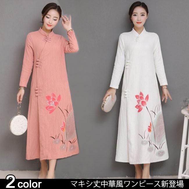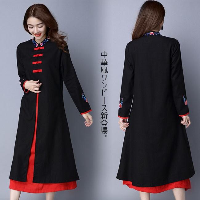 送料無料 ワンピース レディース 長袖 ロング丈 刺繍 中華風 チャイナ