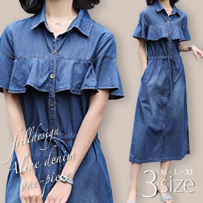 胸元フリルデザイン Aライン ミモレ丈デニムワンピース ロング