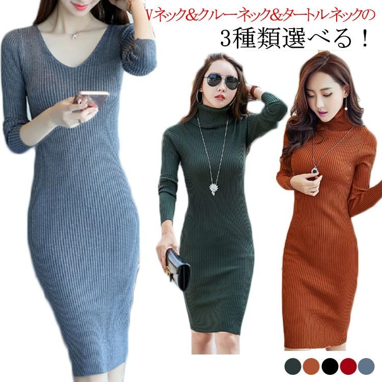 Vネックorクルーネックorタートルネック ニット ワンピース ニット