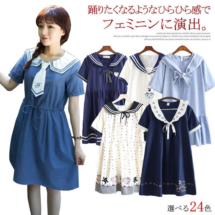 楽天市場 Type豊富 ワンピース セーラー風 半袖ワンピース セーラーカラー 可愛い 高校生 高校女子 ミディアム 夏 リボン ネクタイ 綿麻 リネン 通学送料無料 紙の結晶 楽天市場店