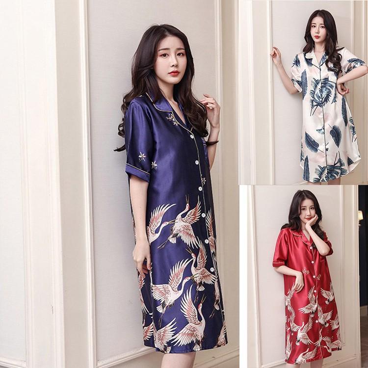 新品 レディース ガウン パジャマ 浴衣風 シルク風 鶴柄 ワンピース 前